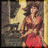 Description: cropped pic of woman with short curly red hair looking up impishly from the lower left corner